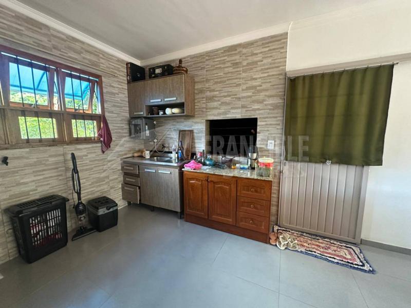 Sala de estar, cozinha, 2 dormitórios, 1 banheiro social, área de serviço, banheiro de serviço (fora), churrasqueira, 4 vagas de garagem (2 cobertas, 2 abertas).